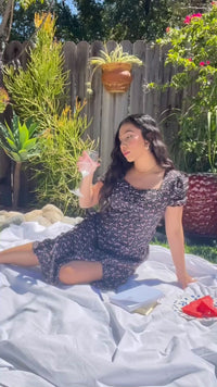 - Features: Short Puff Sleeves, Sweetheart Neckline, Split, Ditsy Floral Print, Midi Dress, A-Line