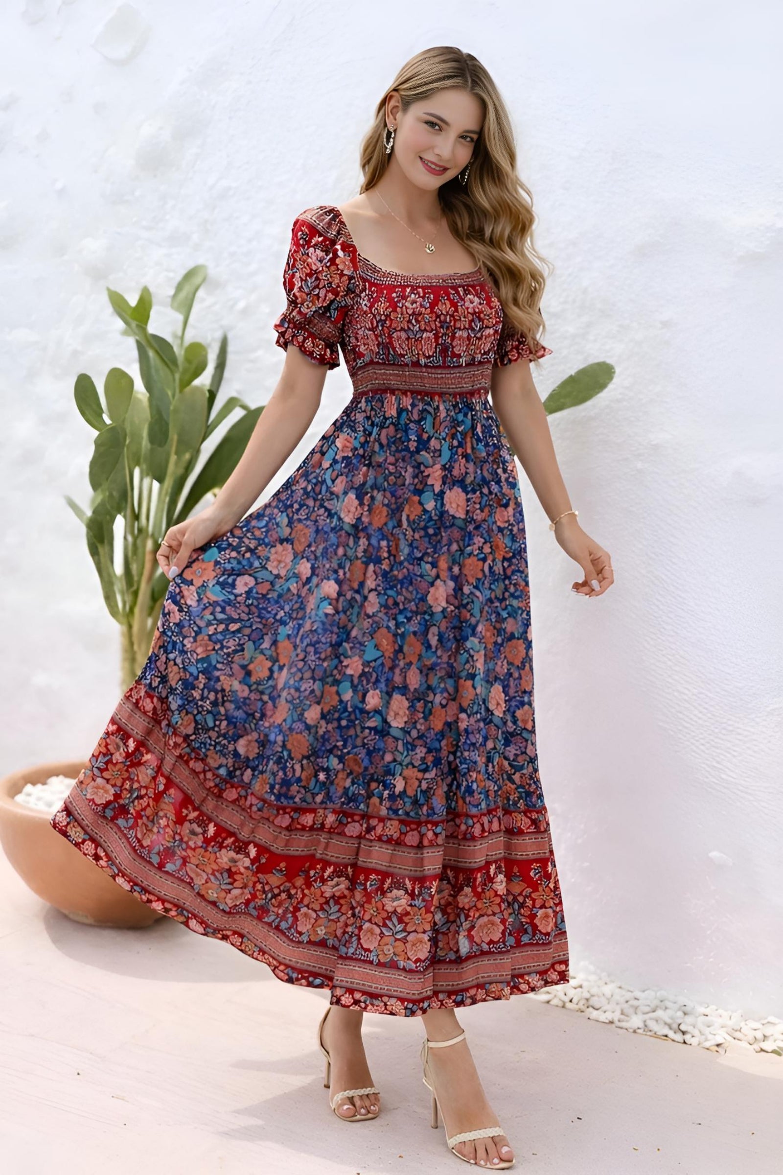 Step into effortless bohemian elegance with this beautifully crafted Women’s Bohemian Floral Maxi Dress, designed for comfort, style, and timeless appeal. Featuring a flattering square neckline and soft puff sleeves, this dress blends vintage charm with a modern, feminine silhouette. The smocked waist hugs comfortably while enhancing your natural shape, flowing into a graceful A-line maxi skirt that moves effortlessly with every step.