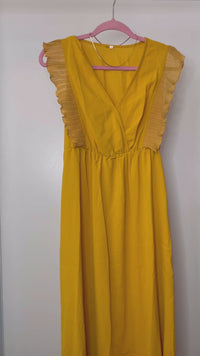 This dress is a beautiful and versatile option for a variety of occasions. It features a flattering deep V-neckline and is sleeveless, making it perfect for warmer weather. The solid plain color and pleated ruffle trim add a touch of elegance to the dress, while the fit and flare, A-line silhouette create a feminine and flattering look. The dress is long and falls to the floor, making it suitable for formal events. It has a regular fit, ensuring comfort and ease of movement. This dress is perfect for a range of occasions, from parties and shopping to vacations and tea parties. It is a great option for spring and summer, and can easily be dressed up or down depending on the occasion.