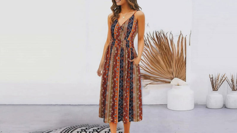 • Features: Spaghetti Strap, V-neck, A-line, Tropical, Mandala & Striped patterned, both side pockets design, midi dress